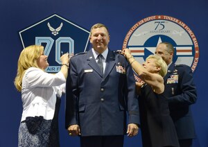 Candy Johnson, left, and Caroline Oliver, right, pinned the rank of major general onto their husband and son, respectively, Maj. Gen. Mark K. Johnson, during his promotion ceremony June 2 at Bldg. 3001’s Hollywood and Vine. Air Force Sustainment Center Commander Lt. Gen. Lee K. Levy II officiated