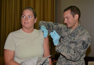 Jim Broughton, 72nd Force Support Squadron Tinker golf course manager, congratulates Lt. Col. Casey Grider, director of operations with the 752nd Operations Support Squadron Air Combat Command. Grider shot 170 yards for a hole-in-one for hole #2 during the Can-Am (Canadian American) Tournament on