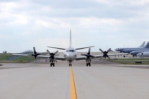 A P-3 Orion from Naval Air Station Jacksonville, Florida, taxies after landing at Tinker Air Force Base, Oklahoma, Oct. 6. The aircraft was one of eleven from NAS Jacksonville that sought shelter from Hurricane Matthew here. (Air Force photo by April McDonald)