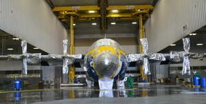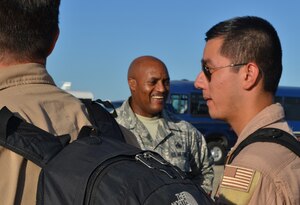 Tech. Sgt. Willie Hoover, center, an information controller with the 89th Aerial Port Squadron at Andrews Air Force Base, Md., describes his duties to Senior Airman Mason, right, 552nd Maintenance Squadron, during a tour of a C-40A aircraft used by the 89th Airlift Wing to transport senior