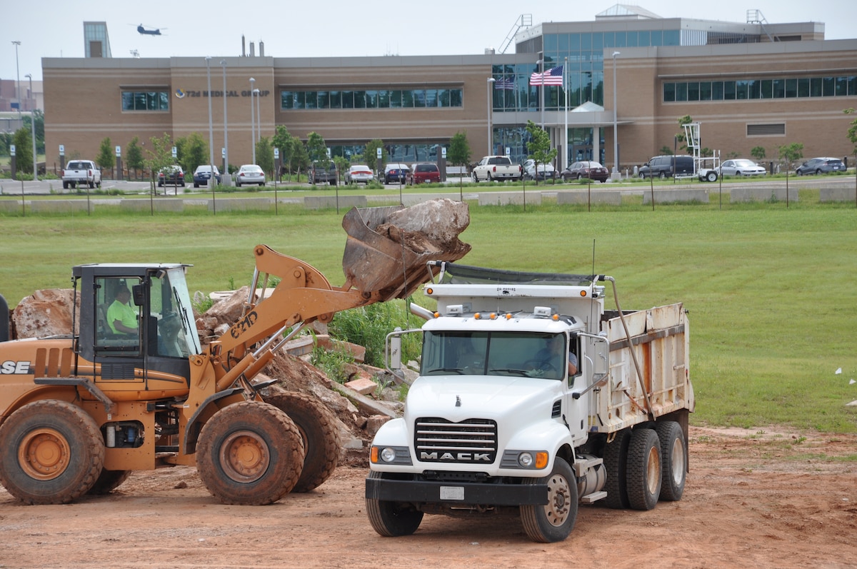 County workers load huge chunks of concrete — about 90 cubic yards came from one of Tinker’s runway projects — to help Oklahoma County officials stabilize and mitigate rapid erosion occurring at the Canadian River and Triple-X Road Bridge. “The riprap we received from Tinker definitely saved this bridge from loss,” said Michael Taylor, second deputy for Oklahoma County District 2. The concrete was being removed from the airfield before repairs could be made. During the state emergency declaration following the severe weather event May 31 and flooding, Oklahoma County officials reached out to public and private partners to secure as much riprap as possible to keep bridges from being undermined. (Air Force photo by Brion Ockenfels)