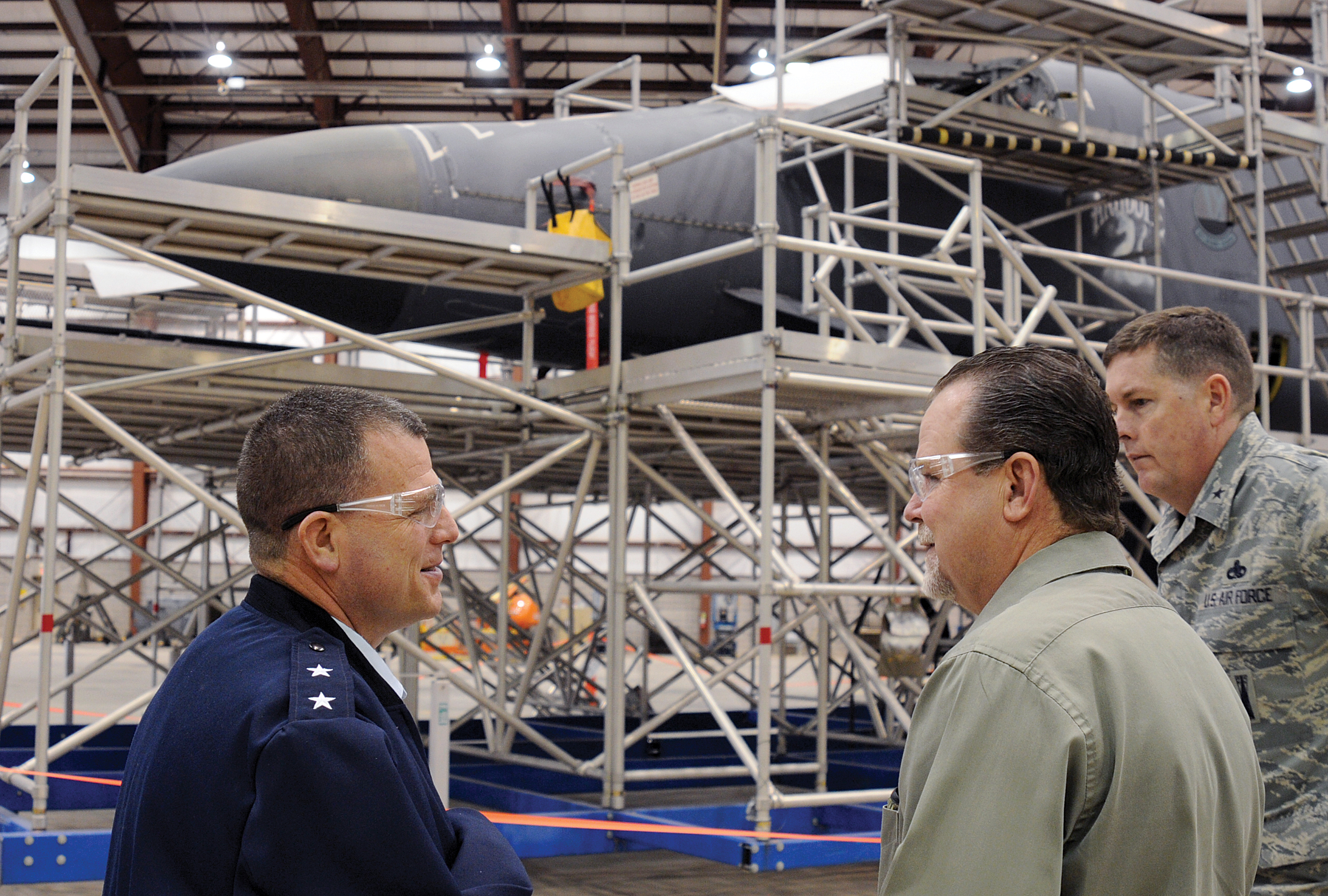 Maj. Gen. Dwyer Dennis, left, Program Executive Officer for Fighters and Bombers, Air Force Life Cycle Management Center at AFMC, Wright-Patterson Air Force Base, Ohio, discusses the B-1 Bomber Integrated Battle Station, IBS, modification under way on the jet nearby during his Jan. 10 visit to Tinker. The general was given a plane-side update in the Maintenance, Repair and Overhaul Technology Center hangar by Chuck Alley, Tinker’s 564th Aircraft Maintenance Squadron, among others. General Dennis’s Jan. 10 visit to Tinker included a town hall meeting with all bomber system program office personnel. (Air Force photo by Margo Wright)