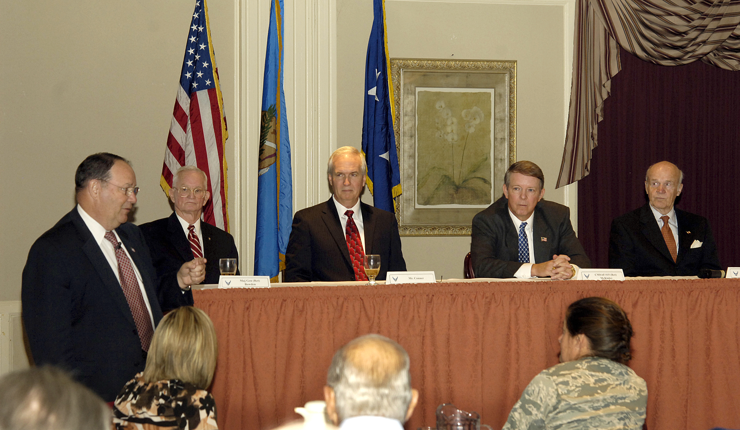 Former Tinker leaders discuss their experiences and share thoughts on the current Air Force as they take questions during a Nov. 17 combined Logistics Officer Association and Air Force Association luncheon at the Tinker Club. Moderating the panel was retired Brig. Gen. Ben Robinson, 552nd Air Control Wing commander from 2000-2002. Seated from left are; retired Maj. Gen. William Bowden, Oklahoma City Air Logistics Center commander from 1985-1989; Robert Conner, OC-ALC director from 2005-2007; retired Chief Master Sgt. of the Air Force Rodney McKinley (2006-2009), who also served in numerous positions at Tinker; and retired Maj. Gen. Jay Edwards, OC-ALC commander from 1980-1982. (Air Force photo by Margo Wright)