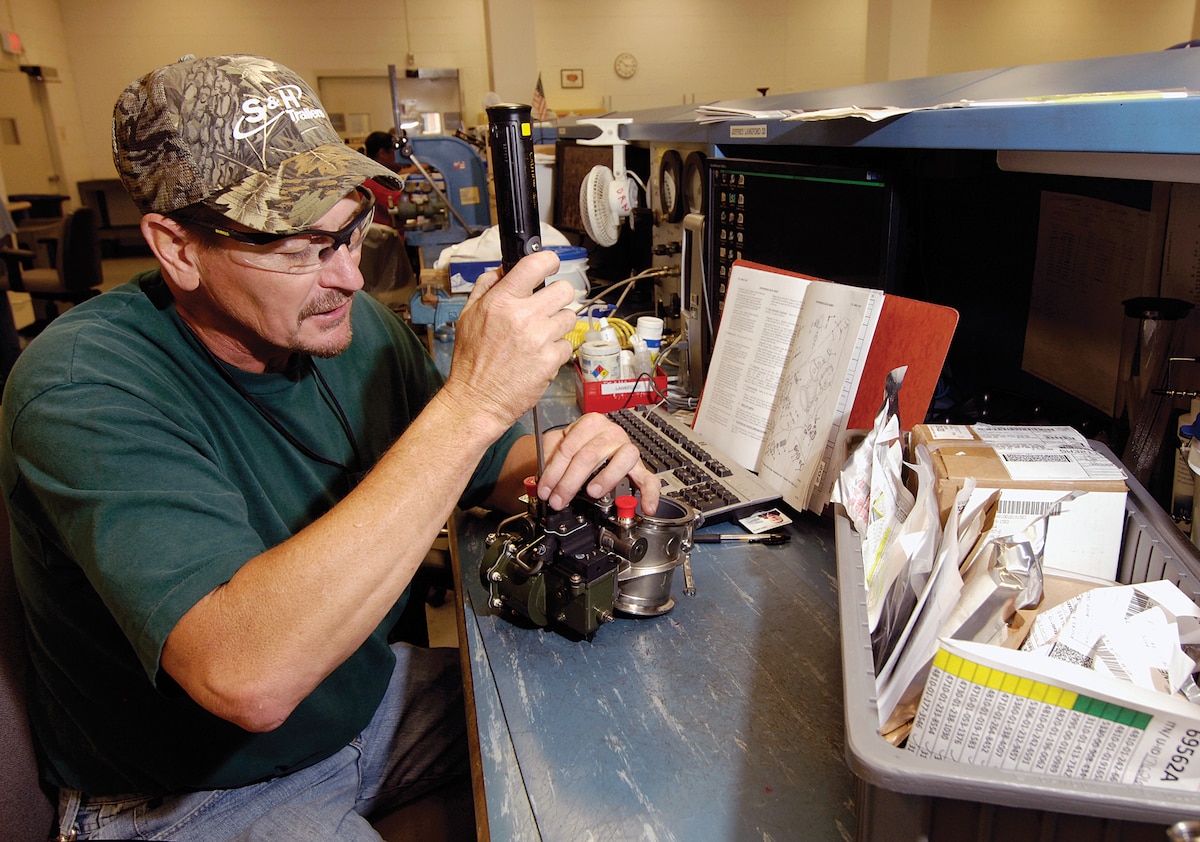 Mechanic Jeff Lankford of the 550th Commodities Maintenance Squadron Air Driven Accessories area, Bldg. 200, builds a C-130 pressure regulator with a SNAP kit of needed parts close by. The Synchronization of Needed Assets and Pre-Positioning kits carry everything to repair an item so mechanics don’t have to chase parts. Kits also reduce redundant parts ordering and turn what a production support technician called a nightmare of paperwork into a manageable system. (Air Force photo by Margo Wright)