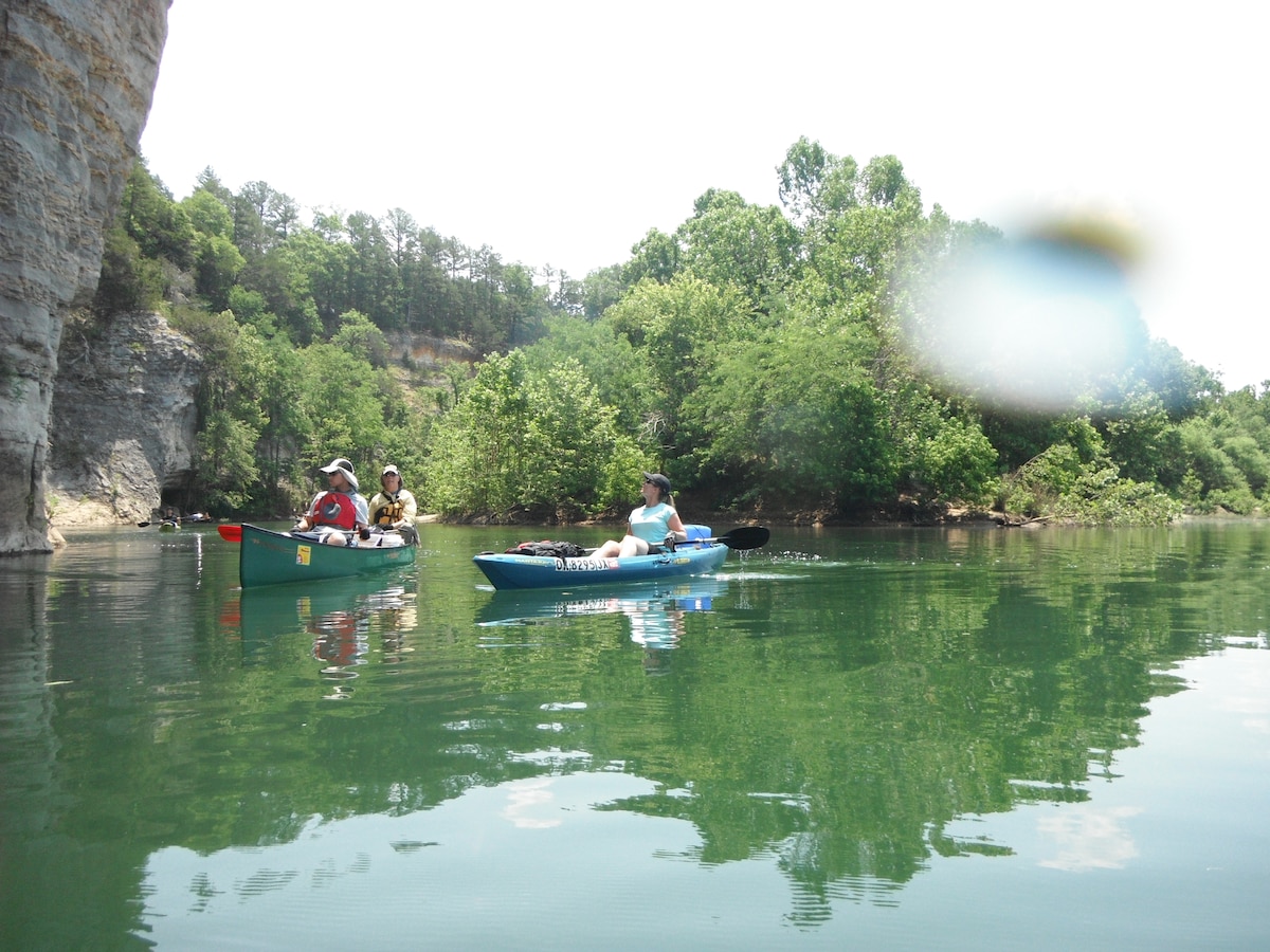 On one of the many shifting shoals along the picturesque Buffalo National River in Arkansas, an enthusiastic group discovered the perfect place for basking in early morning sunlight after breakfast on an Outdoor Recreation-sponsored trip June 10-11. Jeff Gerlitz, ODR programs coordinator, John Cordon, volunteer trip leader, and Staff Sgt. Marcus Magnant, 552nd Air Control Wing, Communications Squadron, not only enjoy the great outdoors and opportunities ODR trips inspire, but always find camaraderie while perfecting outdoor skills. Everyone in the eight member group had differing levels of paddling experience, all in good physical condition and enjoyed the challenges of paddling more than 41 miles in just under two days on the water. (Air Force photo by Brion Ockenfels)
