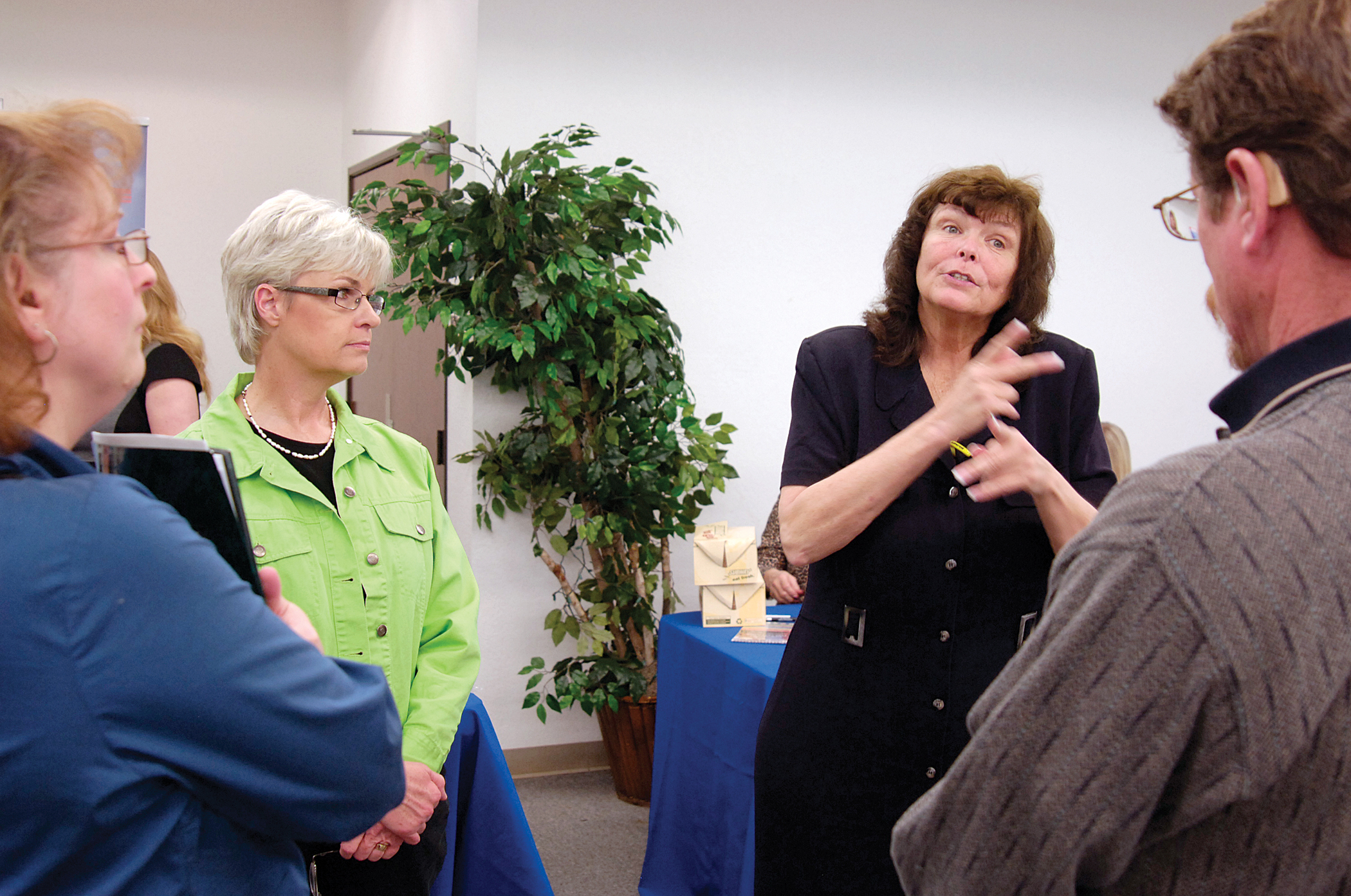 Tinker’s volunteer sign language interpreters Pam Strange, left, and Patti Wilson, right, provide information for job seekers Linda VanBuskirk, Norman, and Ronald Stoops, Moore, during the Government-Wide Career Fair for people with disabilities. Tinker was a co-host of the first career fair of its kind, providing volunteers to help attendees as needed. (Air Force photo by Margo Wright)