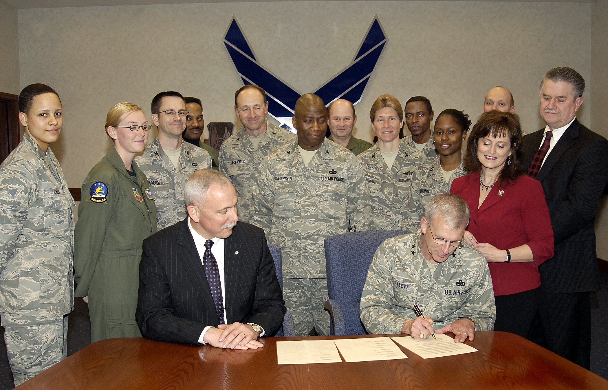 Maj. Gen. P. David Gillett Jr., Oklahoma City Air Logistics Center commander, and Mr. John Over, OC-ALC executive director, were the first of several base leaders who gathered to sign a Sexual Assault Awareness Month proclamation April 8 showing Tinker’s commitment to ending sexual assault through education, training and providing help to victims of the crime. “The problem won’t go away if we ignore it,” said the commander, who gave statistics, showing that Oklahoma ranks sixth in the nation for reported rapes and in the Air Force, 607 cases of sexual assault were reported last year. Other signers included commanders from the Navy, the 507th Air Refueling Wing, 552nd Air Control Wing and the 72nd Air Base Wing. Victim advocates and others attended the signing held in the Anaconda Room of Bldg. 3001. (Air Force photo/Margo Wright)