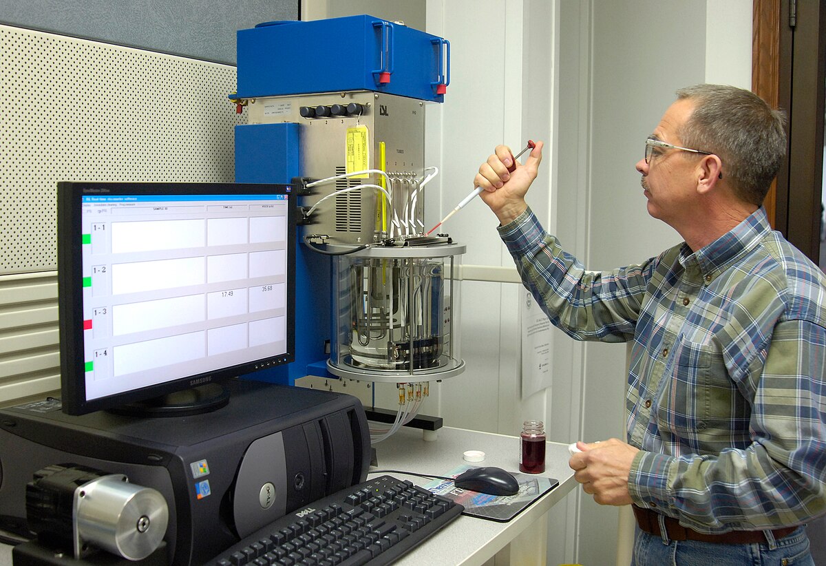 When a millionth of an inch mi-alignment can cause the creation of unusable parts, a special laser is needed to keep production flowing. Walt Grimes, back, and Robert Hague use the laser annually or when requested to test equipment like a multi-axis machine in Bldg. 3001. (Air Force photo/Margo Wright)