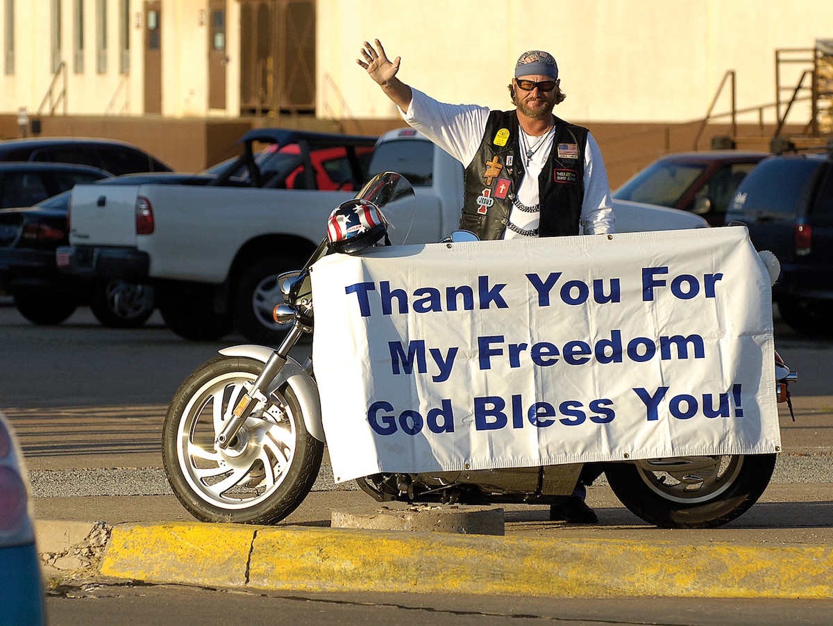Elton Nimmo greets Tinker workers inside the Eaker Gate Wednesday and will smile and wave them home in the evening from inside the Vance Gate, The disabled veteran Army radio operator began waving, and often saluting, to those in uniform Aug. 1 with the passion to let the military know they are appreciated. “Troops don’t get enough recognition,” the retired private first class said. “I’d like to line up each troop and shake each hand. If I can make their day a little brighter, let them know what they’re doing makes a difference, than I go home feeling good.” Mr. Nimmo’s stepson is a Tinker security forces airman currently deployed and his son is with the Army, stationed at Peterson, AFB., Colo. Asked if the recent 106-degree days were an issue, he shrugs it off and waves at the next driver. “It’s a lot hotter in Iraq”, he said. (Air Force photo/Margo Wright)