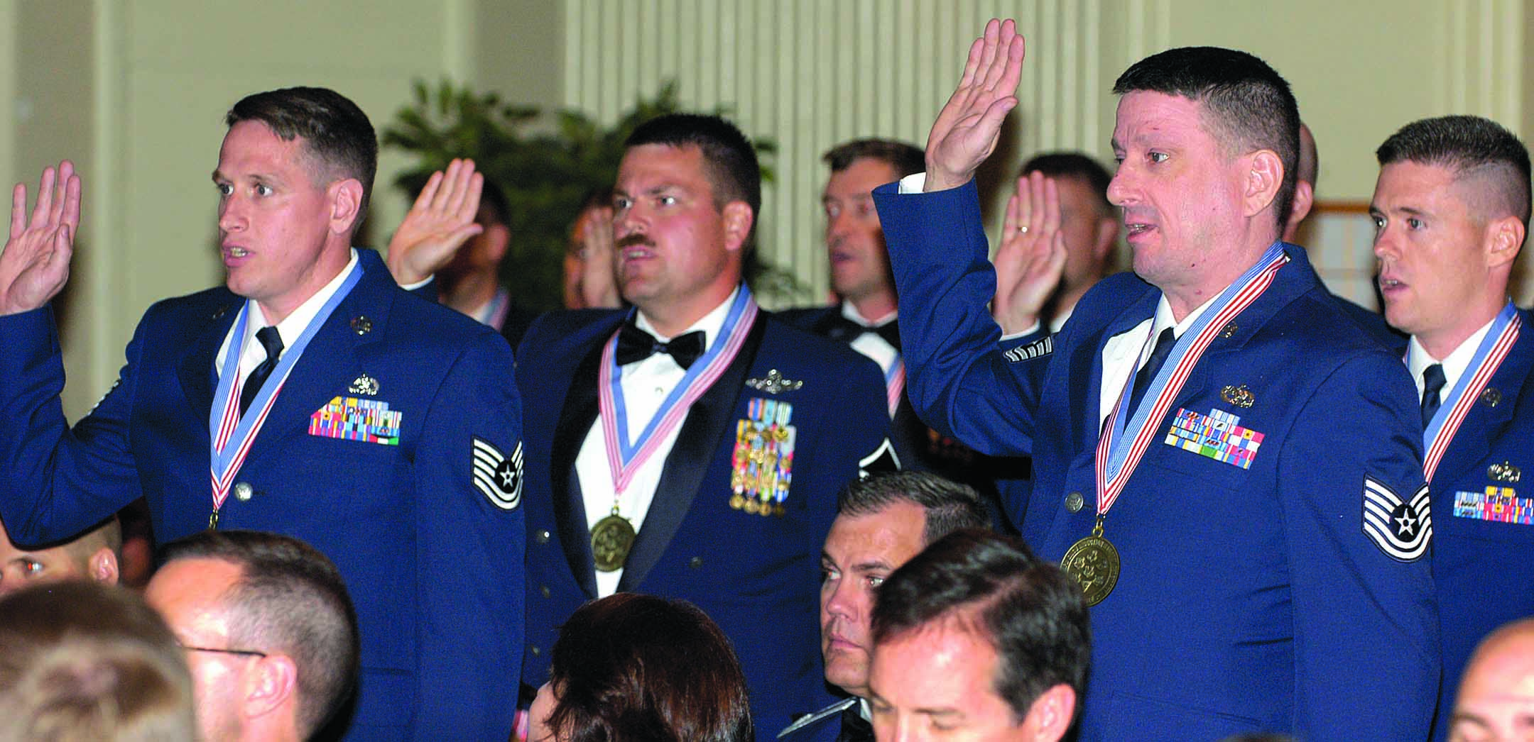 Senior Master Sgt. Bethann Fleming, Chief Master Sgt. Roddy Hartsook and Master Sgt. Don Lester, from left, light candles representing the three noncommissioned officer levels during the Sept. 21 Senior Noncommissioned Officers Induction Banquet at the Tinker Club. (Air Force photo by Margo Wright)