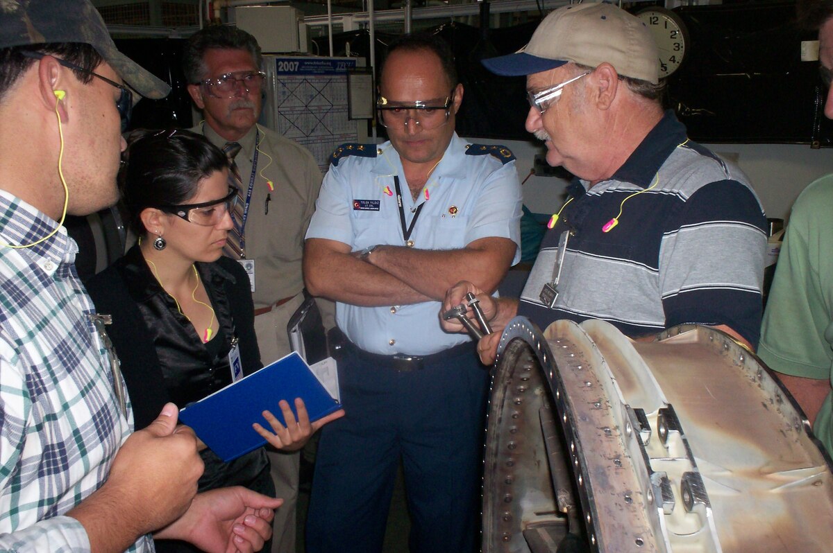 Jack McSwain, 548th Propulsion Maintenance Squadron welding supervisor, explains the oil tube welding process to Turkish welding engineer Burcu Okur during a visit July 9 and 10. Looking on are, from left, Darren Raines, 548th PMXS welder; Larry Waite, Turkish program manager with the 748th Combat Sustainment Group; and Lt. Col. Tolga Yidiz, Turkish air force liaison. (Air Force photo by 2nd Lt. Eric Scott)
