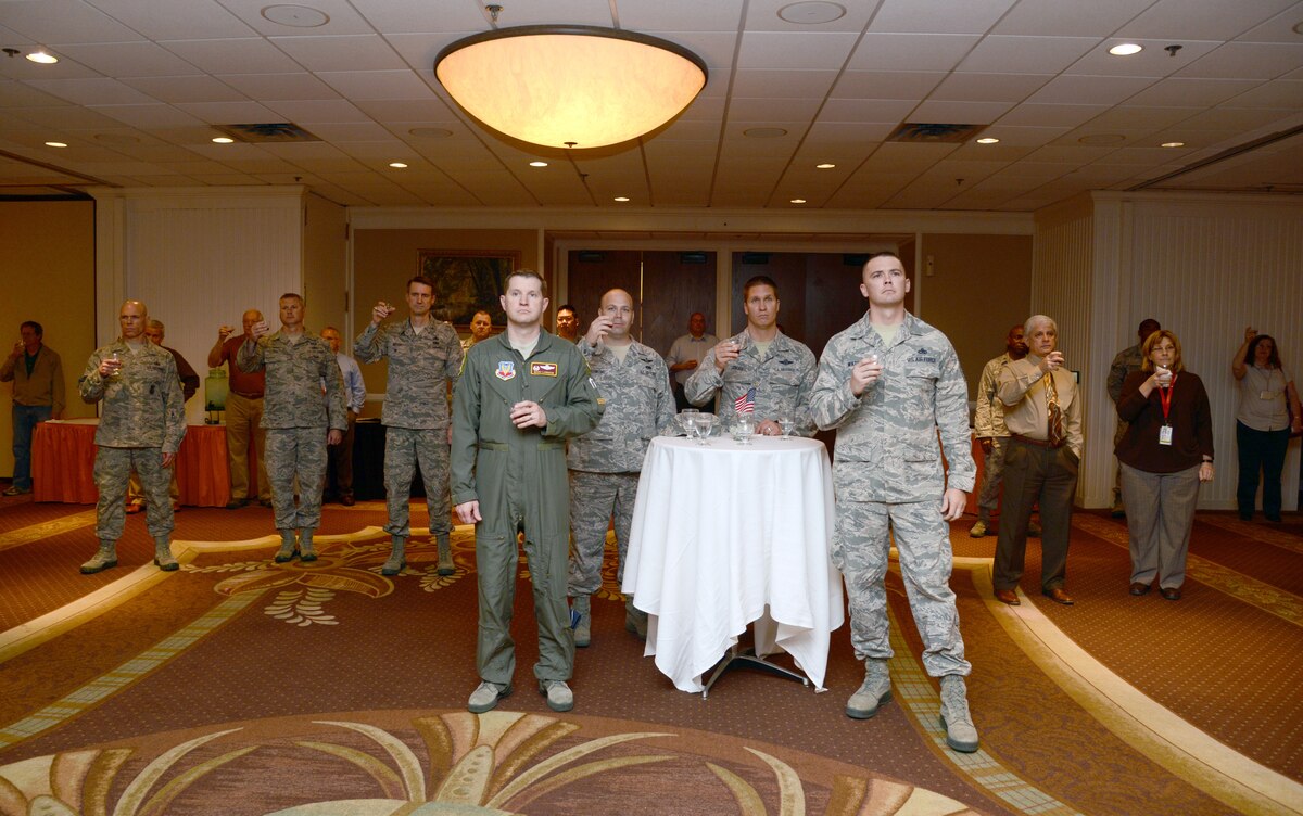 The Tinker Club and Moet Hennessy USA hosted a toast to the Doolittle Tokyo Raiders on April 18 to honor the 80 men, led by Lt. Col. James “Jimmy” Doolittle, on April 18, 1942, during World War II, who flew a bombing mission to Japan after the bombing of Pearl Harbor. The mission was basically a suicide mission, especially having to launch 200 miles off the Japanese coast knowing there wasn’t enough fuel to return to the aircraft carrier. Sixty-two out of the 80 survived and the surviving Raiders have met annually on April 18 since the 1950s to toast their fallen comrades. On Nov. 9, 2013, the four remaining Raiders met (one was too ill for the ceremony, but watched online) one last time and opened the bottle of cognac gifted to their leader almost 56 years before. The significance of their last toast together symbolized the completion of their mission. Currently, only two Doolittle Tokyo Raiders survive: Lt. Col. Richard Cole and Staff Sgt. David Thatcher. (Air Force photo by Kelly White/Released)