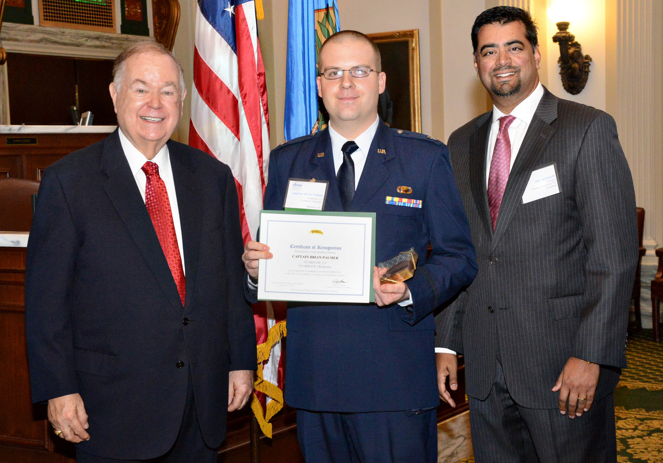 Capt. Brian Palmer, with the Air Force Life Cycle Management Center, received a certificate of recognition for being an outstanding mentor with Starbase 2.0 at Oklahoma Mentor Day at the state Capitol on Jan. 8. Presenting the award were the University of Oklahoma President and founder of the Oklahoma Foundation for Excellence David O. Boren, left, and the Oklahoma Foundation for Excellence President Anil Gollahalli. Captain Palmer volunteers his time with the Advanced Science and Technology Charter School after-school club, helping the students with STEM-focused projects. (Air Force photo by Kelly White/Released)