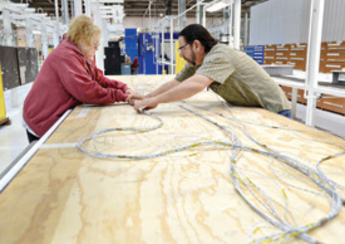 Linda Burrows, with the 552nd Commodities Maintenance Group’s cable harness shop, and Donald Califf, with the 567th Aircraft Maintenance Squadron’s Maintenance Repair Overhaul Technology Center, work together to reformat a wire harness into connectors. The harness is built in the cable harness shop and then installed at the MROTC. Air Force photo by Kelly White/Released