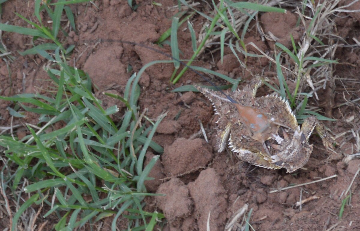 A Texas horned lizard, equipped with a tiny tracking device, checks out his surroundings at the Wildlife Expo. Members of the Natural Resources team attach the transmitters to the lizards with temporary adhesive, then release the lizard back into the grasslands on Tinker. The lizards don’t stray far, but their camouflage and small size make locating them a learned feat for researchers. (Air Force photo by April McDonald)